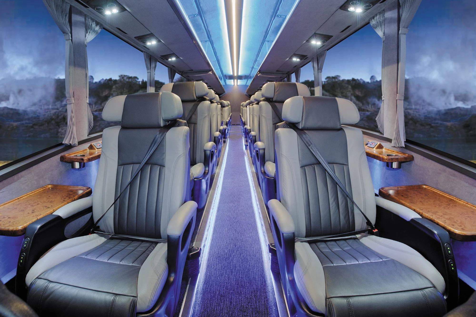 Panoramic viewing, air conditioning, seat belts and onboard restroom